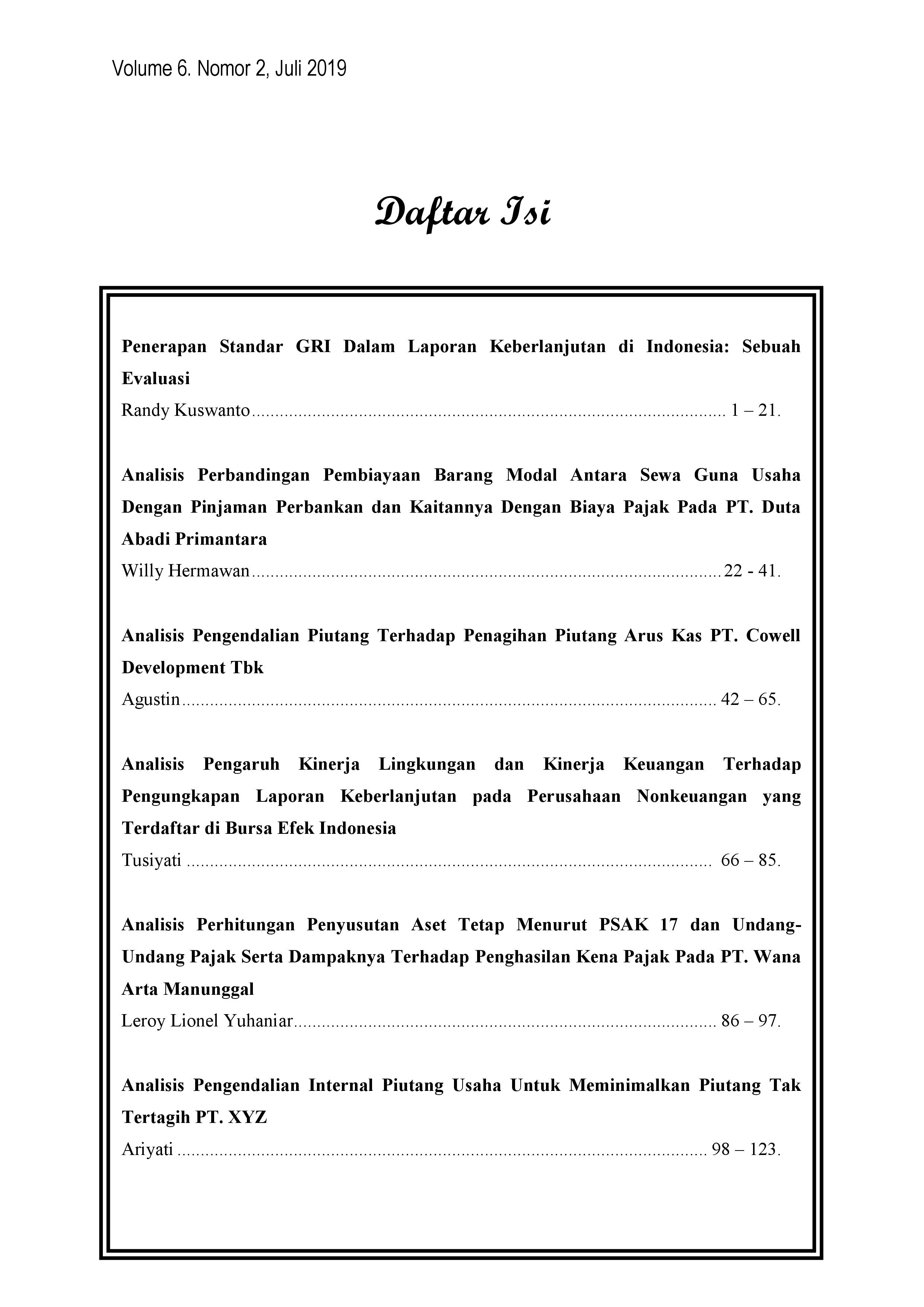 Jurnal Bina Akuntansi Volume 6 Nomor 2 Tahun 2019. Pada edisi ini JBA mengangkat penelitian mengenai topik mengenai Akuntansi Keberlanjutan, Sewa Guna Usaha, Pengendalian Internal, Piutang Usaha dan Perpajakan. Secara spesifik topik yang dibahas dalam edisi ini adalah Laporan Keberlanjutan, Leasing, Pengendalian atas Piutang dagang, dan Penyusutsan Aset Tetap . Artikel berisi hasil penelitian dari para akademisi dari berbagai perguruan tinggi di Indonesia.