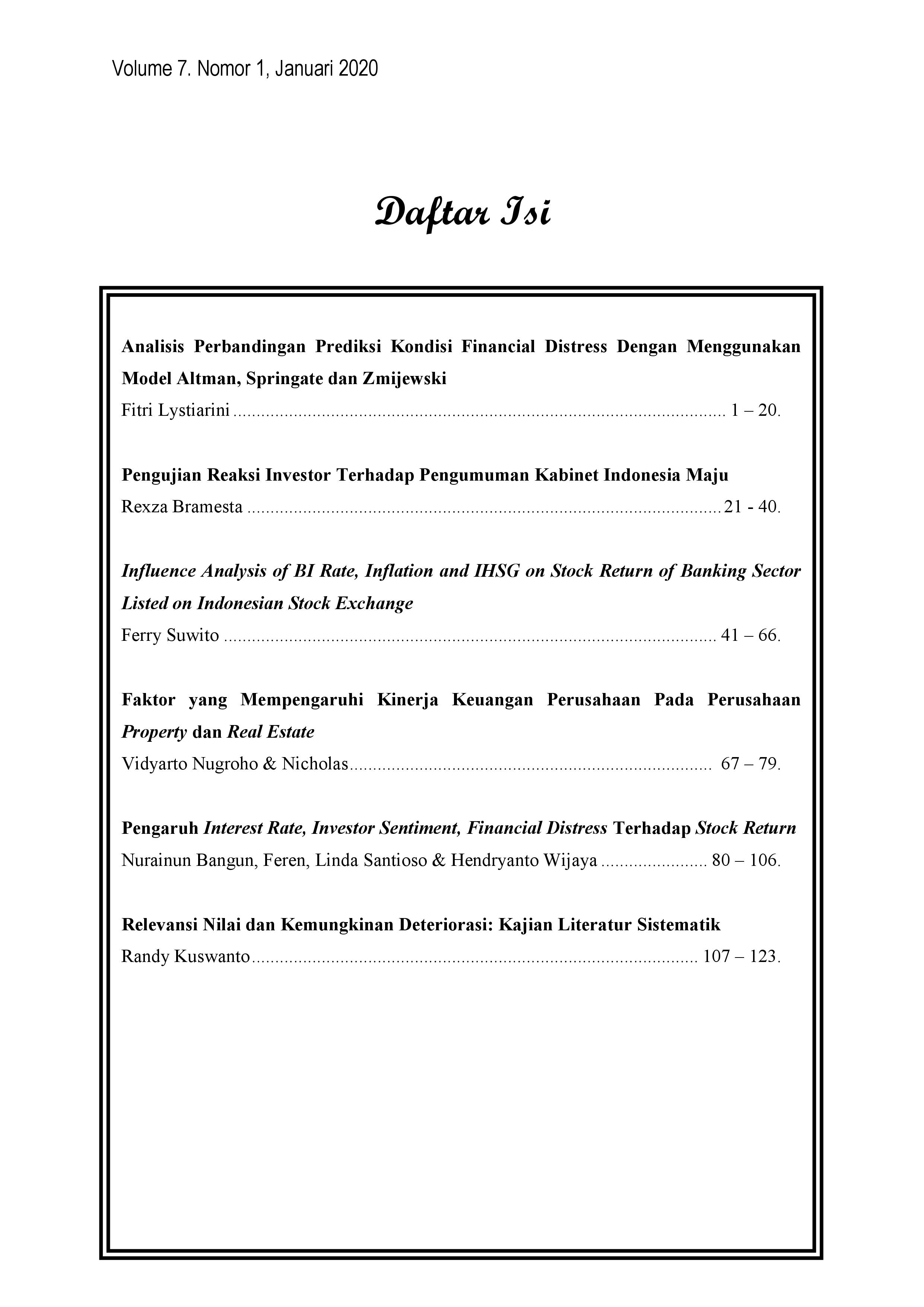Jurnal Bina Akuntansi Volume 7 Nomor 1 Tahun 2020. Pada edisi JBA ini mengangkat penelitian mengenai topik Model Kebangkrutan, Studi Peristiwa, Return Saham, Kinerja Perusahaan dan Relevensi Nilai. Artikel berisi hasil penelitian dari para akademisi dan praktisi dari berbagai perguruan tinggi di Indonesia.
