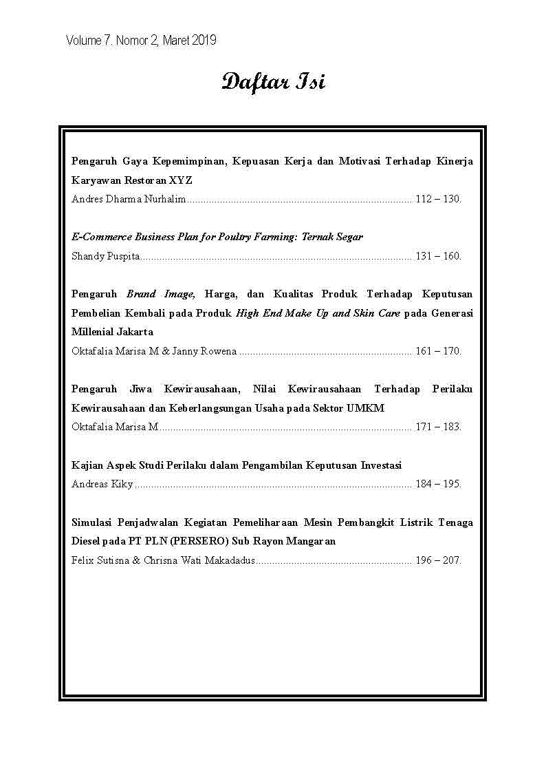 Jurnal Bina Manajemen Volume 7 Nomor 2 Tahun 2019. Pada edisi ini JBM mengangkat penelitian mengenai Manajemen Sumber Daya Manusia, Manajemen Pemasaran, Kewirausahaan, Studi Perilaku Keuangan, Manajemen Operasional dan Business Feasibility Study. Secara spesifik topik yang dibahas dalam edisi ini adalah Employee Motivation, Brand Image, Studi Kelayakan Usaha, Entrepreneurship Soul, dan Monte Carlo Simulation. Artikel berisi hasil penelitian dari para akademisi dari berbagai perguruan tinggi di Indonesia.